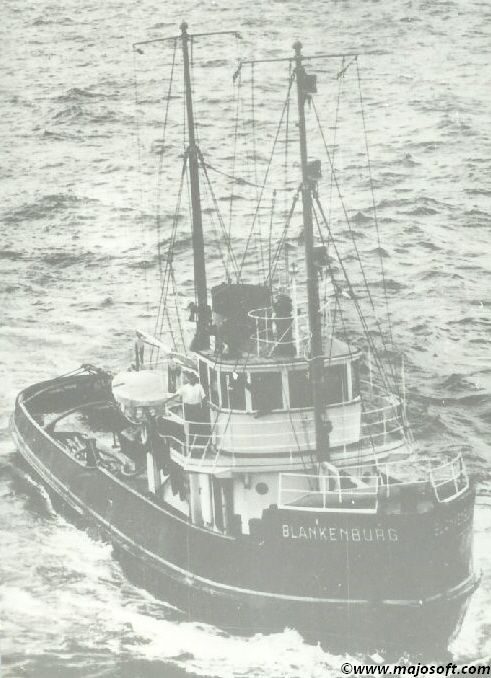 De ms BLANKENBURG voor de haven van MAASSLUIS met haar sleep waar hij zal overgenomen door havensleepboten. |